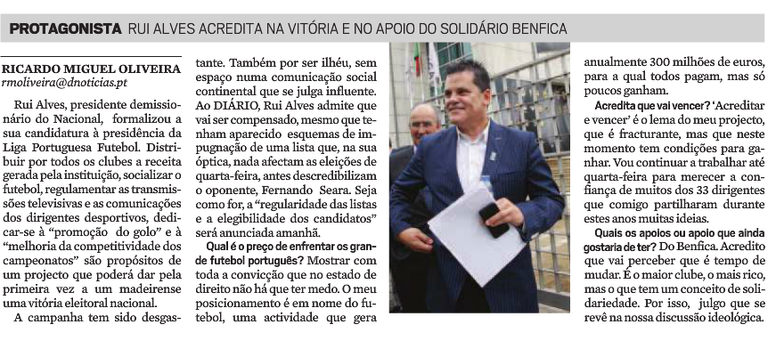 O eng.º Rui Alves, candidato a presidencia da Liga Portuguesa de Futebol Profissional, concedeu uma entrevista ao Diario de Noticias da MAdeira, publicada este domingo.