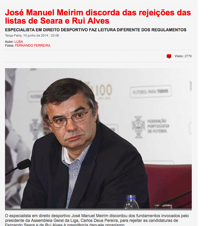 Em declarações reproduzidas na edição on-line do jornal Record, o especialista em direito desportivo José Manuel Meirim discordou dos fundamentos invocados pelo presidente da Assembleia Geral da Liga, Carlos Deus Pereira, para rejeitar as candidaturas de Fernando Seara e de Rui Alves à presidência daquele organismo.