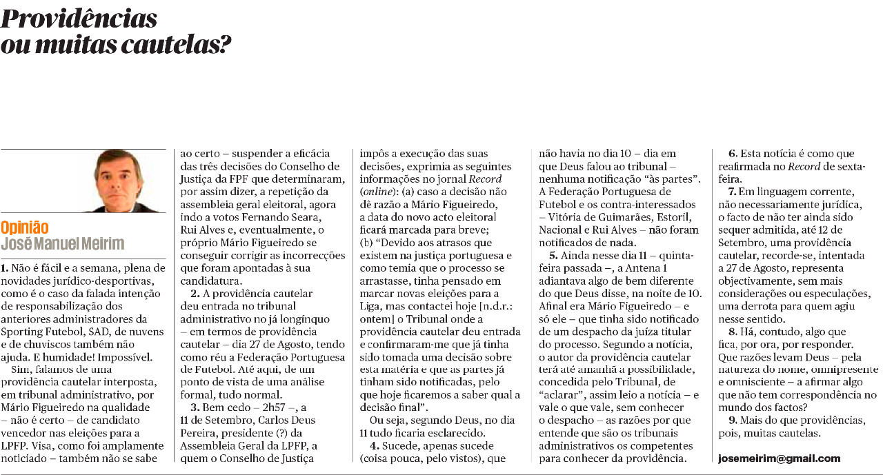 Por isso mesmo, antes de entregar a decisão do futuro do futebol português nas mãos do Conselho Superior do Desporto, que a acontecer constituirá uma clara ingerência governamental, coisa que, como se sabe, não é tolerada pela FIFA e originará por certo um pesado castigo, há antes que ter uma decisão do Conselho de Justiça sobre os recursos apresentados.